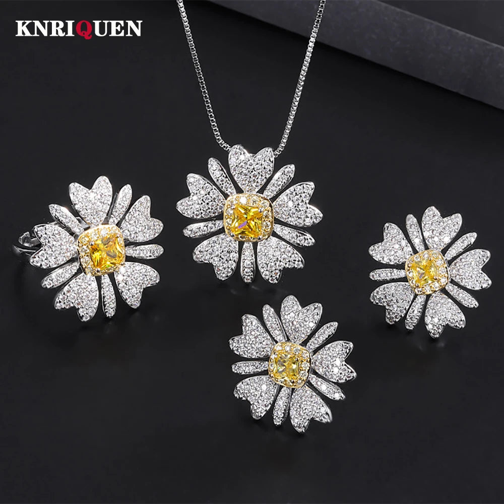 Topaz Sunflower Gemstone Necklace Pendant Ring Earrings Wedding Party Fine Jewelry Set for Women Birthday Gift