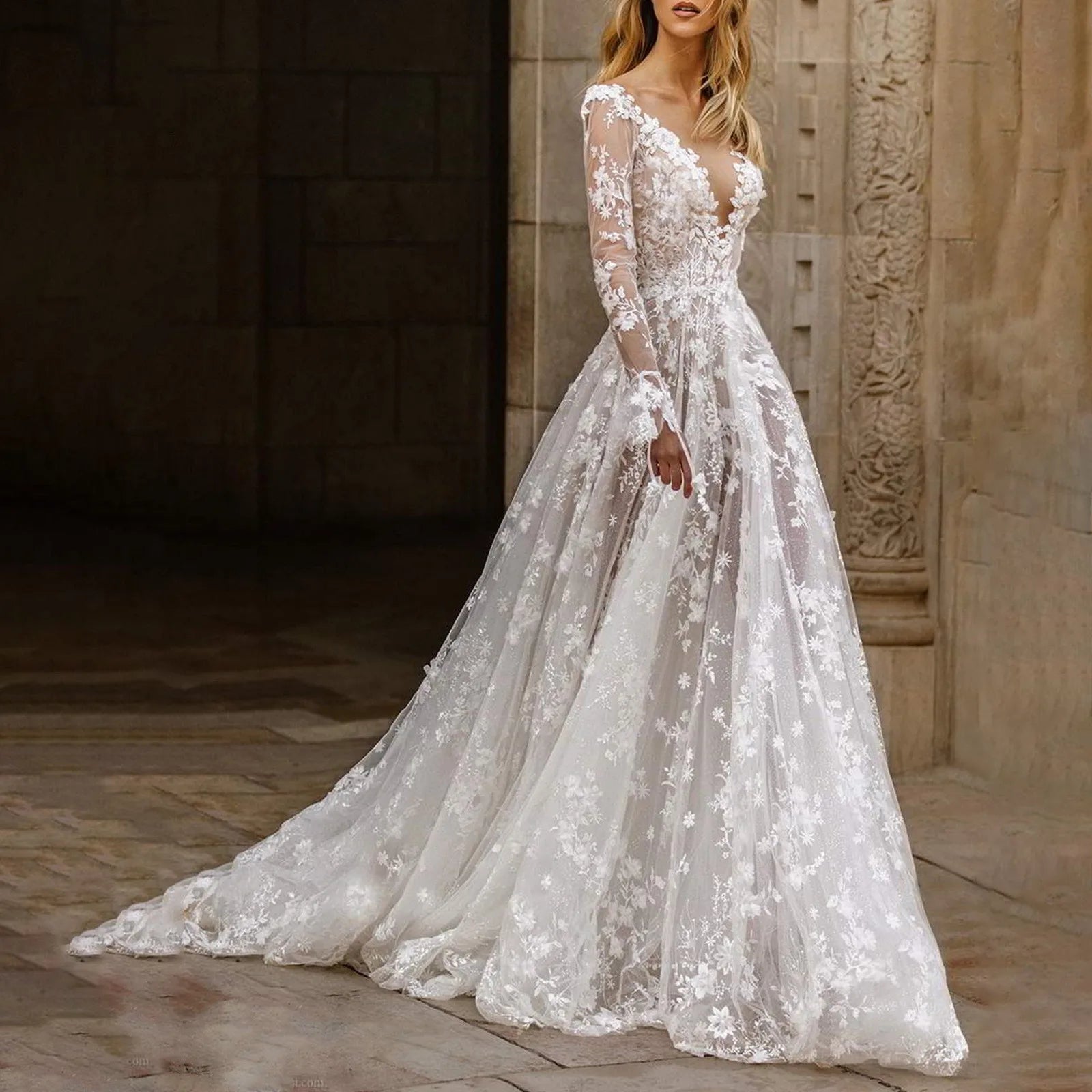 Ladies Spring Summer Sexy Deep V Lace Mesh Long Sleeve Dress Wedding Dress Dress