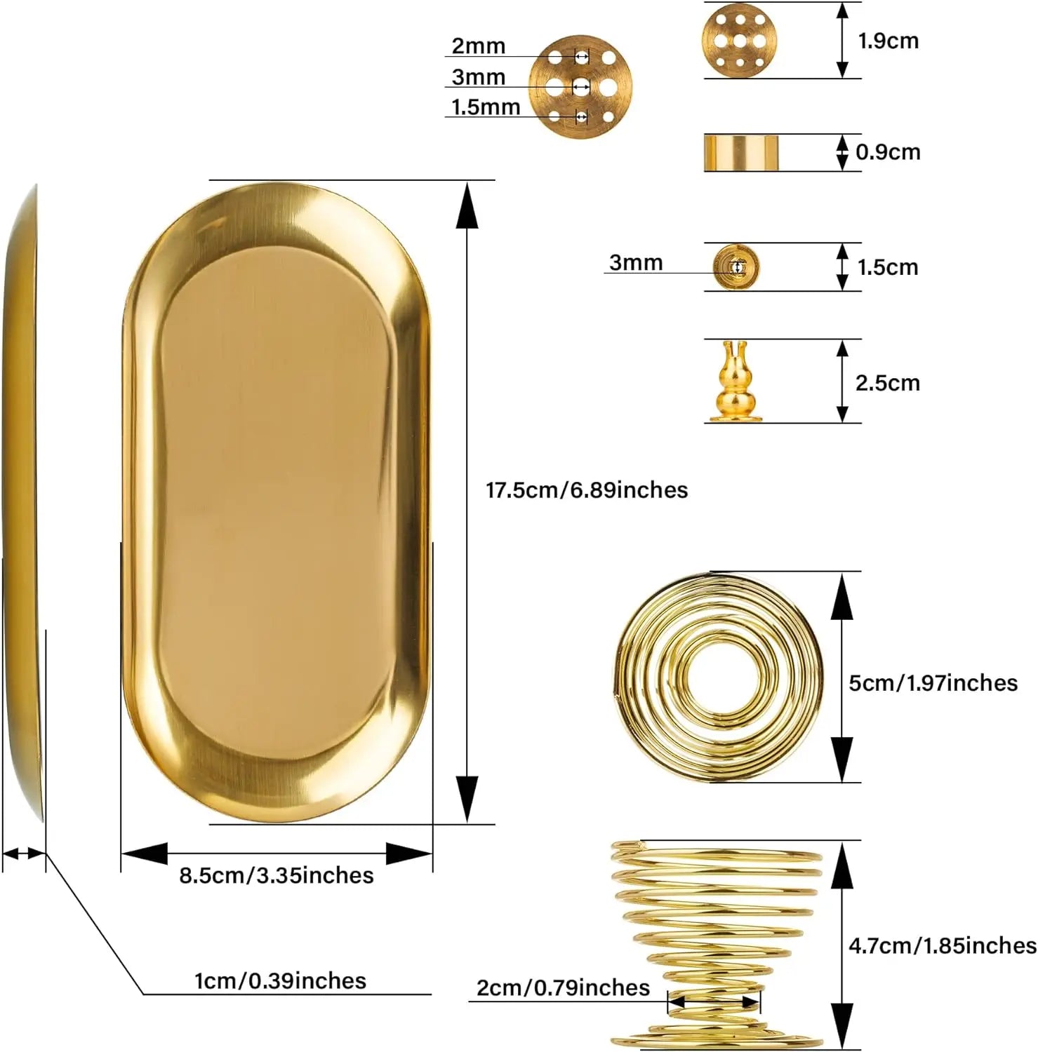 PACKAGE INCLUDE - 1 metal tray(6.89*3.35inch); 1 brass gourd-shaped incense holder, the maximum diameter of the incense that can be inserted is 0.3cm(0.12inch); 1 9-hole disc-shaped holder with three size hole(0.1cm/0.2cm/0.3cm), 1 Palo Santo or sage stick holder with a diameter of 5cm(1.9inch). The specific size as shown in the picture.