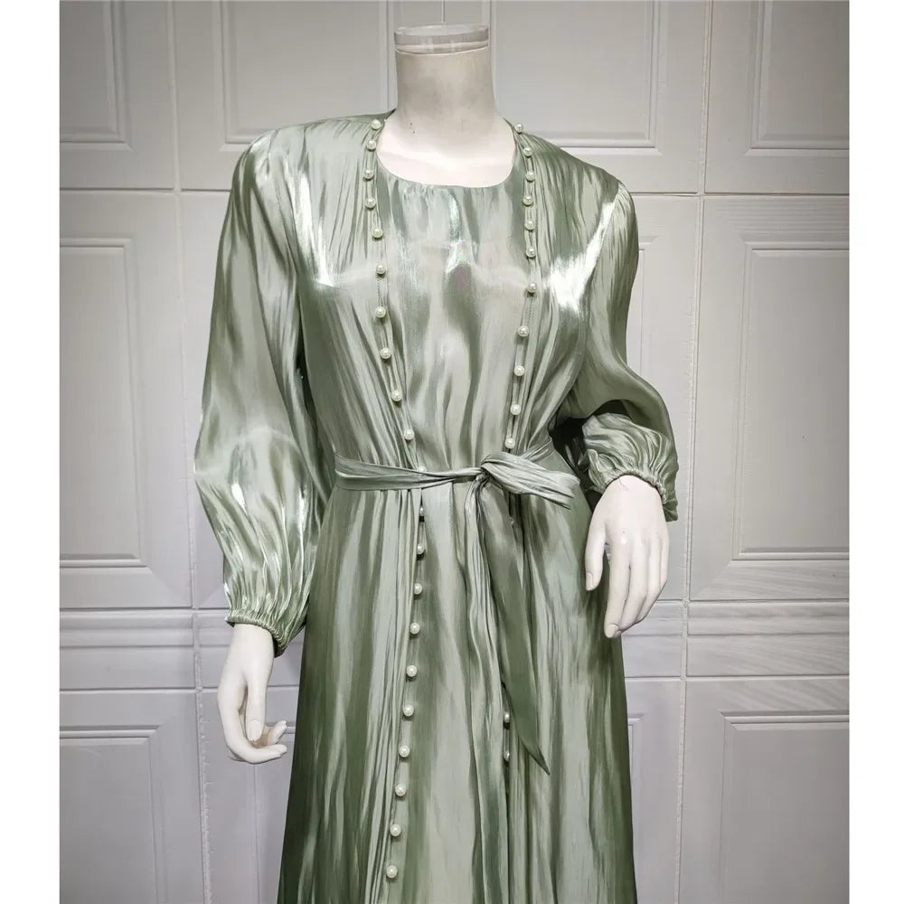 Elegant Muslim Abaya 2 Pieces Matching Sets Beads Satin Women Hijab Dress Evening Gown Turkey Arab Islam Outfits Caftan Moroccan