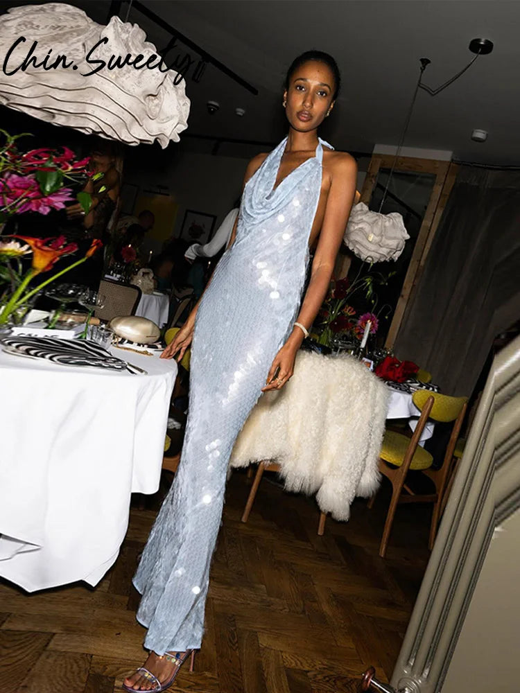 Euphoria Sequin Backless Party Dress Women Chic Sleeveless Lace Up Blue Female Evening Dresses 2025 Lady Bodycon Robe