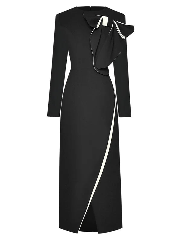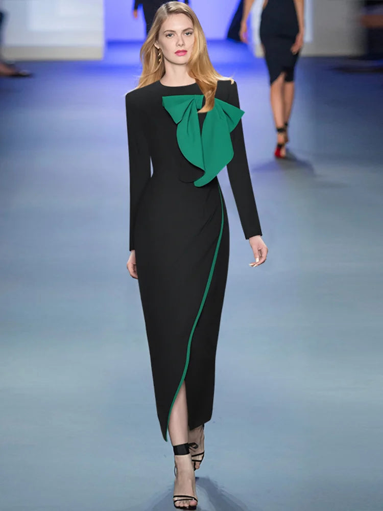 Bow Spliced Formal Dresses For Women Round Neck Long Sleeved Mid Length Contrast Slim Party Dress New Clothing