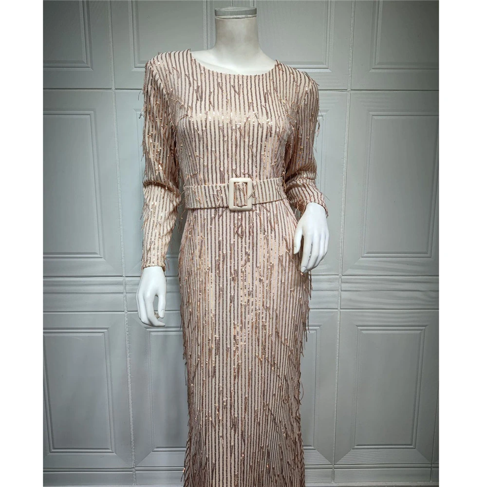 Luxury Sequin Evening Dress Party Maxi Dress Muslim Abaya Women Belted Dress Long Prom Dress Islamic Vestidos Dubai Wedding Gown