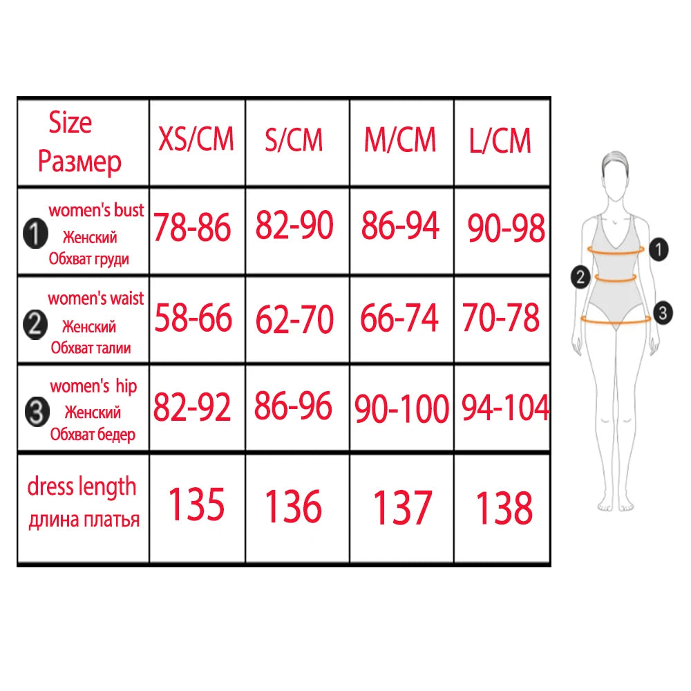 size L fit: women bust 90-98 cm, women waist 70-78 cm, women hip 94-104 cm,dress length 138 cm