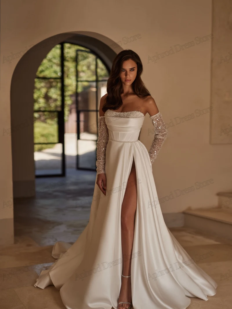 Modern Wedding Dresses A-Line Satin Pleat Bridal Gowns Sequin Appliques Sexy Robes High Slit Vestidos De Novia Customized