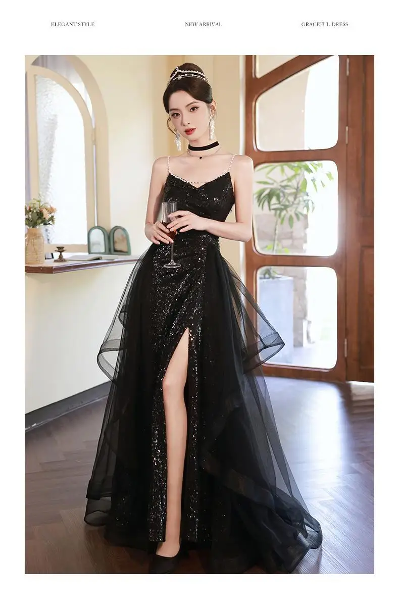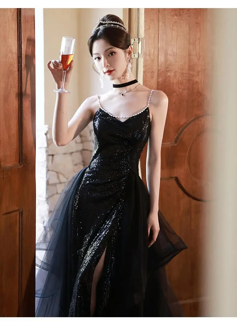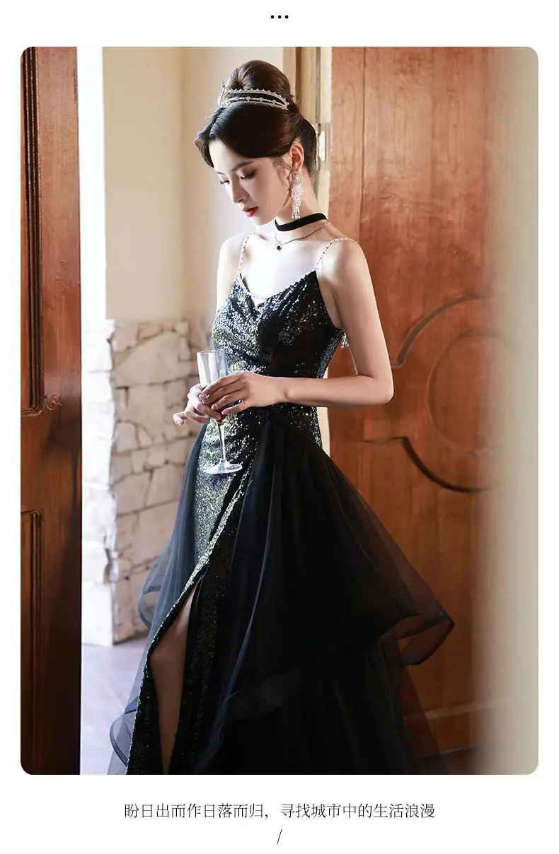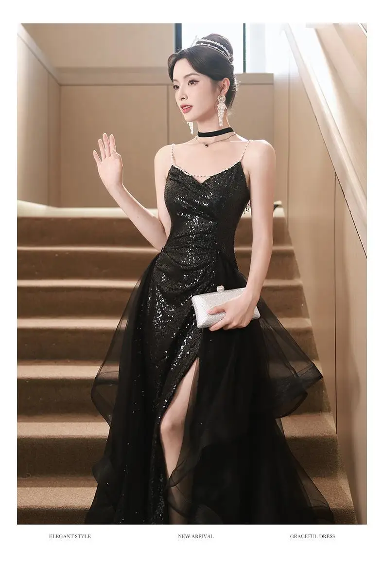 New Black long sequined removable tail lady girl women princess banquet party performance prom dress performance gown