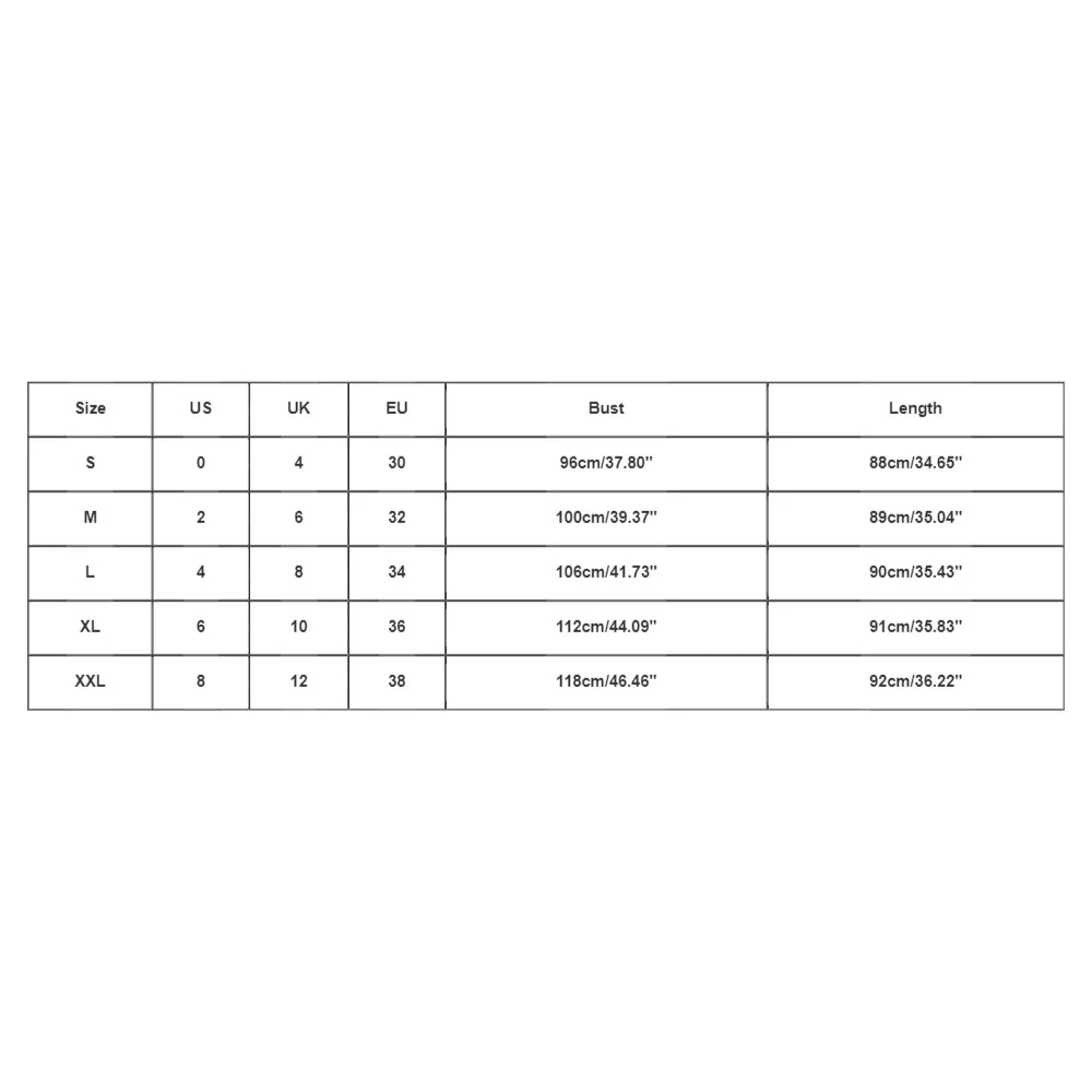| Size:XXL | US:8 | UK:12 | EU:38 | Bust:118cm/46.46'' | Length:92cm/36.22'' |