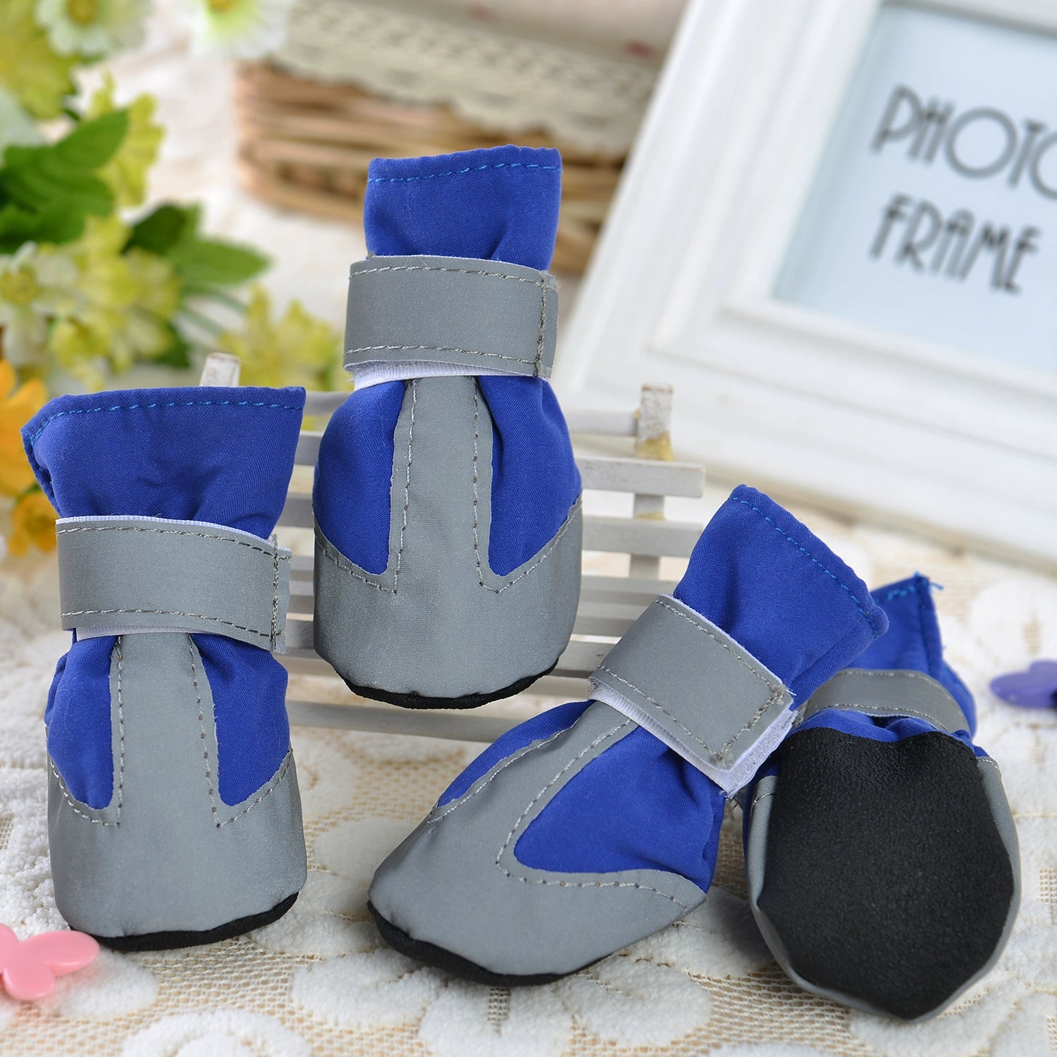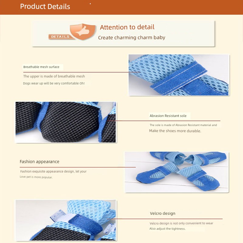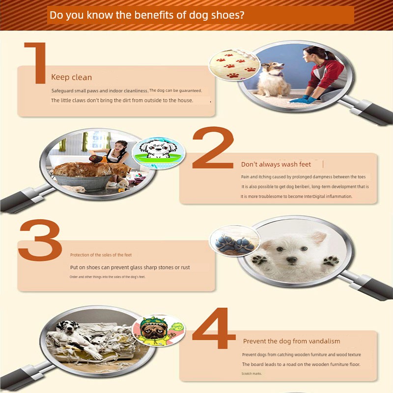 Benefits .dogs can wear shoes to prevent things such as glass sharp stones or Rust nails from being inserted into the soles of dogs. , because dogs don't care about whether there are bricks and stones under their feet when walking, especially dogs who are very fond of running. After a sudden run, it is easy to hurt their feet. At the same time, it also prevents sand grains or stones from moving their feet to the toes, especially for puppies, whose soles are very tender.