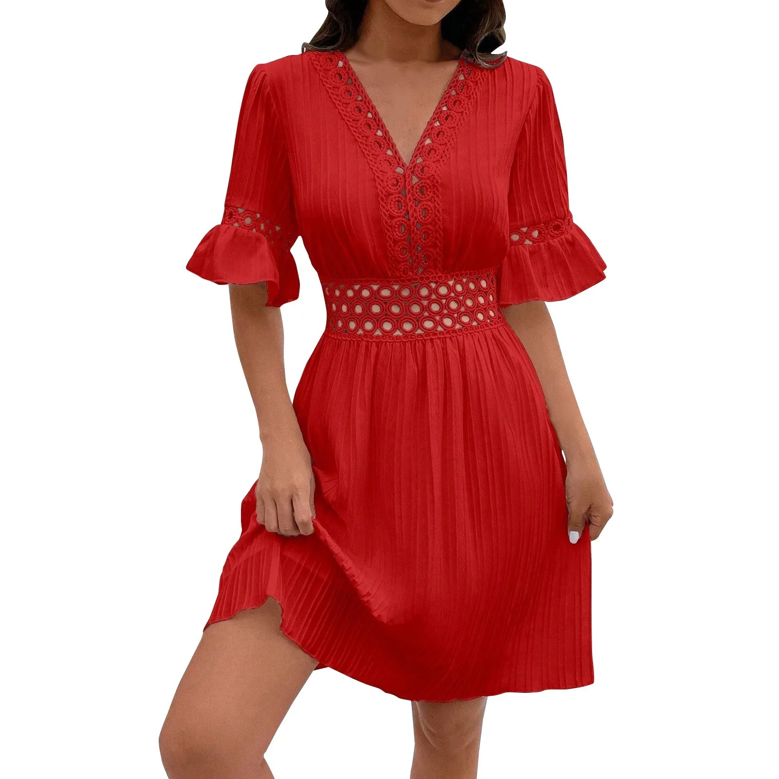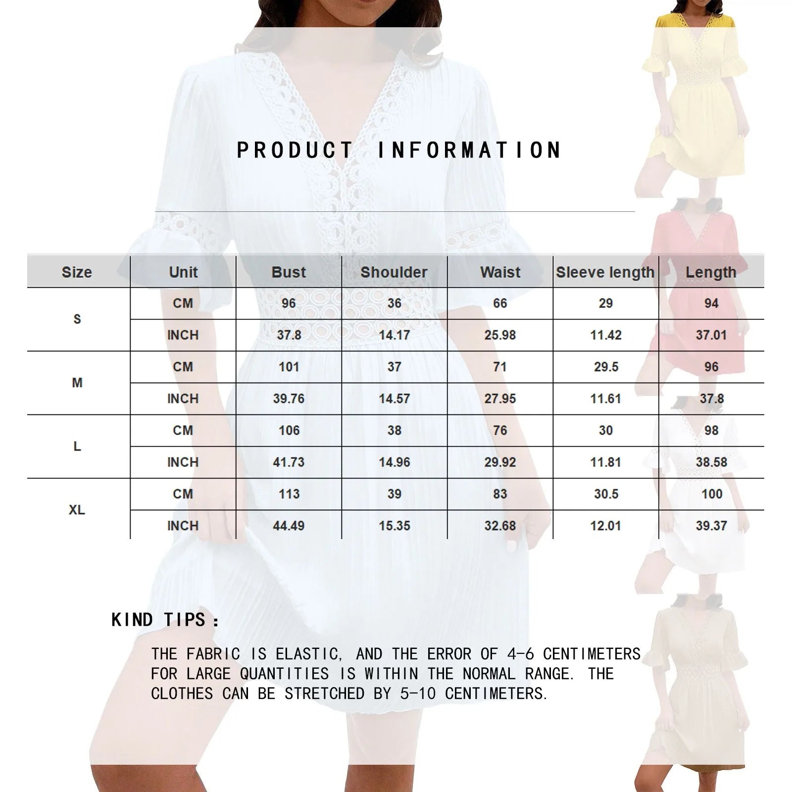 Women Sexy V Neck Flying sleeve Mini Dress Summer Hollow Embroidery Lace Patchwork Party Dress Casual Loose Beach A-Line Dress